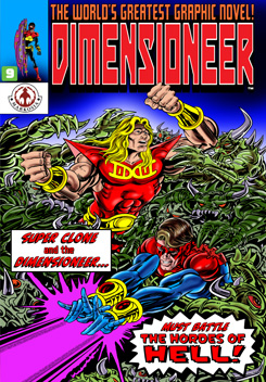 Introducing into the Dimension’s Universe…. Super Clone! A hero that will be unlike anything you’re ever seen! This startling issue has battles galore as the Dimensioneer teams up with a soul who has been trapped in the Hell Dimension for untold years… his body being ripped to shreds by hoards of flying demons and then reformed…. only to have the same unholy thing happen over and over again!